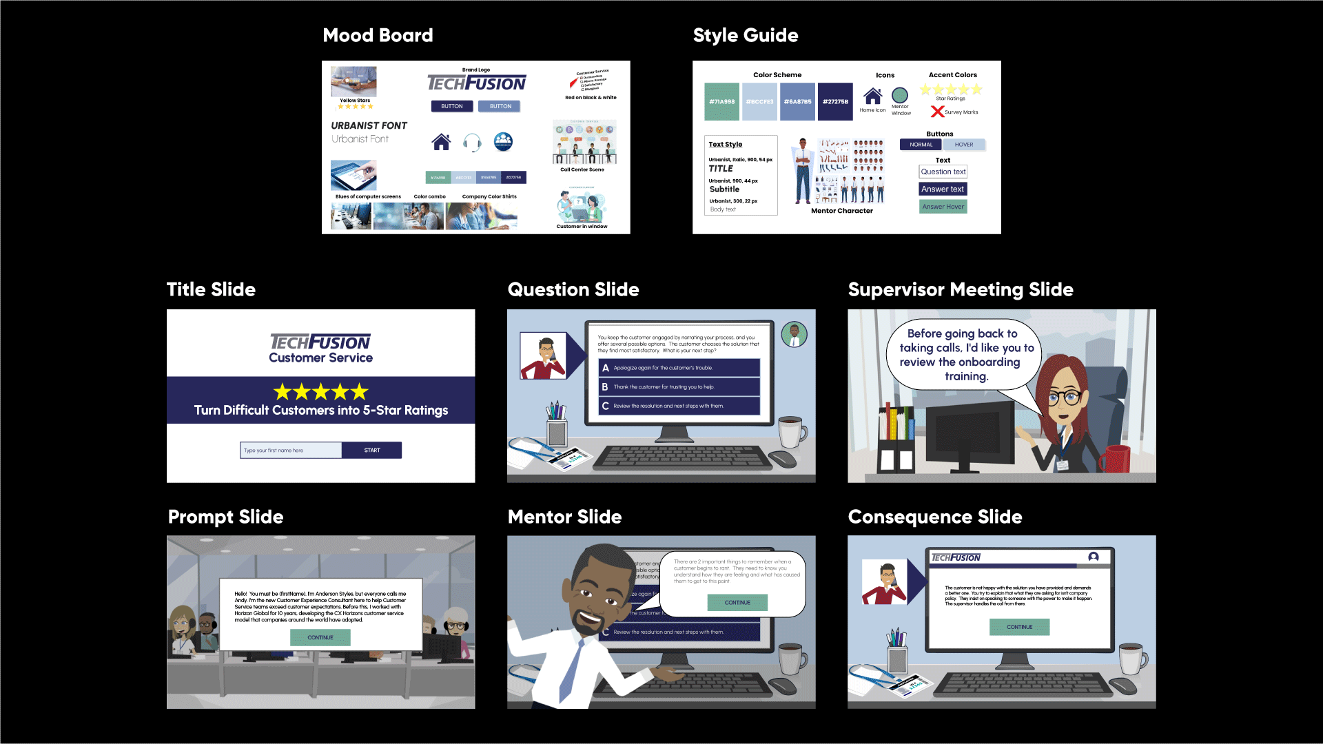 Once I identified high-priority actions, I created a blueprint for the entire course with a text-based storyboard. In order to immerse the learner in this experience, I set the story in the call center to mimic the context in which learners will be applying learned behaviors. I created a mentor character, to provide professional guidance anytime the learner wants support with their decision-making. I included real-world consequences for incorrect choices and positive rewards for making the correct choice.