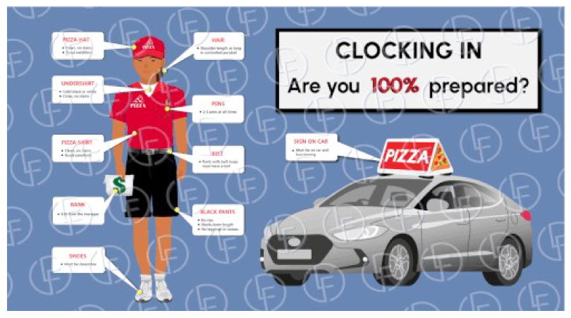 The simplest solution I envisioned was a job aid (poster) to hang by the time clock clearly identifying what was required to be in place before delivery drivers were allowed to clock in. He loved the idea and took it back to the owner for approval. Being that this was a franchise of a national corporation, he had permission to display the poster as long as it wasn’t visible to the public. This was one of 5 stores owned by this particular franchisee, and he was excited about the idea for all of his stores. I designed a prototype of the poster and sent it to my son and the owner for feedback. After implementing the feedback, I created a final draft of the poster and sent it over for approval. It was a big hit.